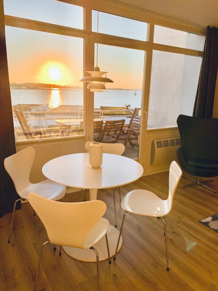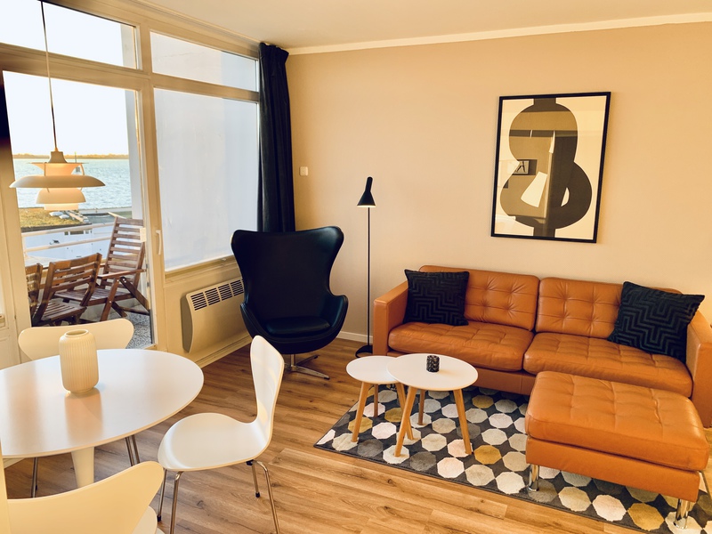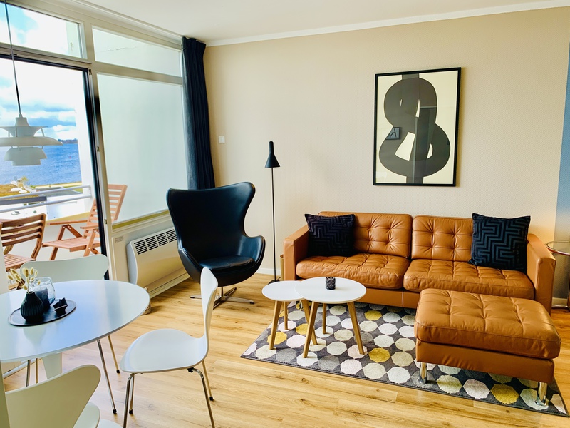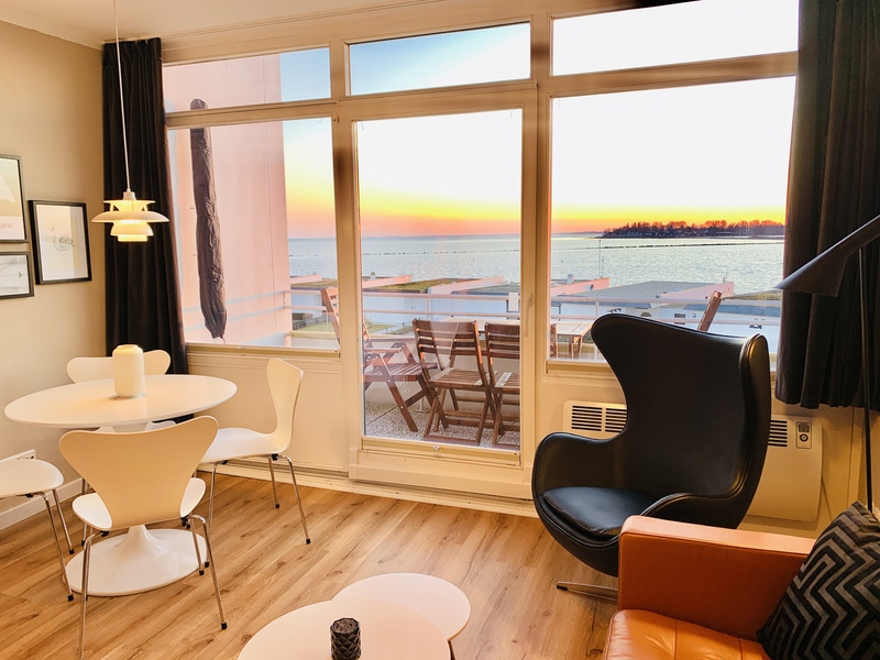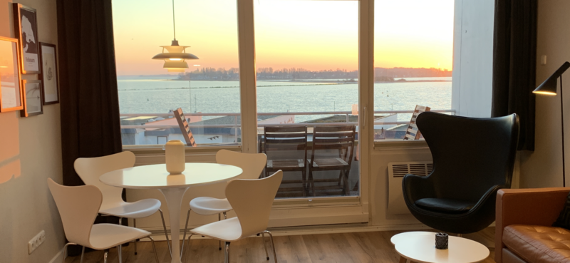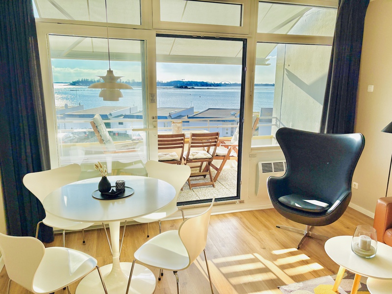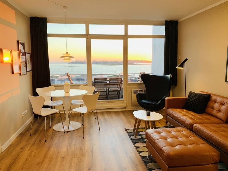 schnelles Internet per WLAN (bis zu 100 MBit/s ohne Volumenbegrenzung), großzügige Couch mit Hocker, dreh- und kippbarer "Ei-Sessel", Esstisch mit vier Stühlen (Original Arne Jacobsen) und Meerblick.