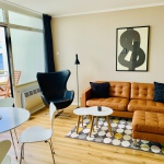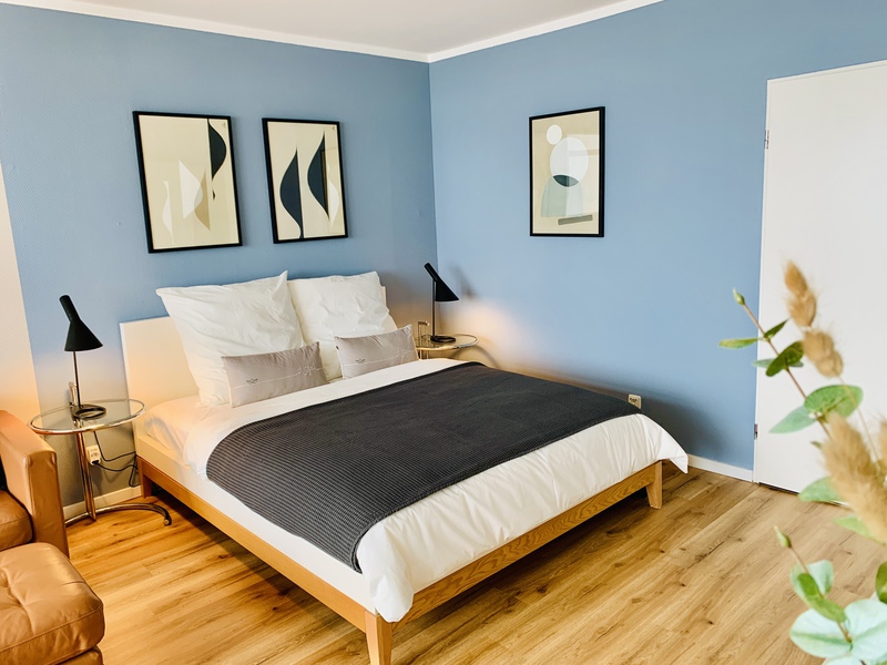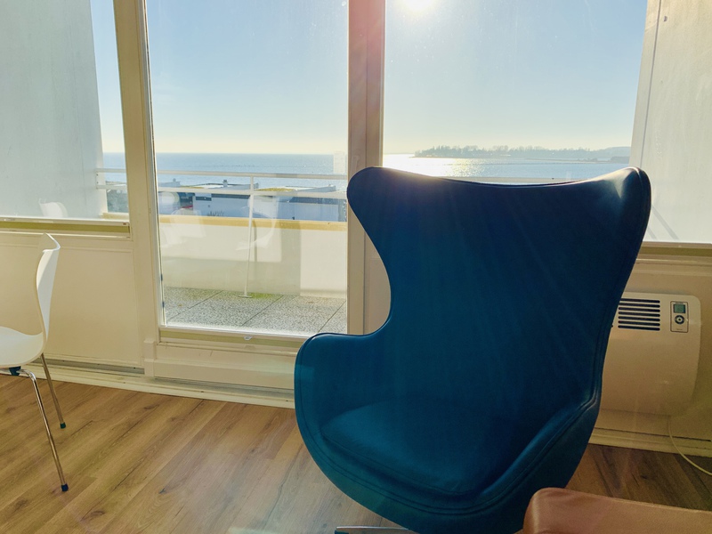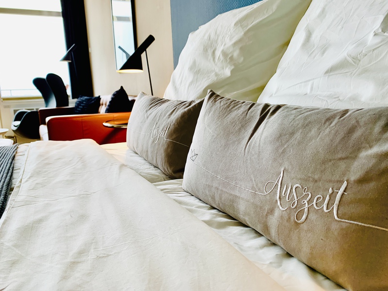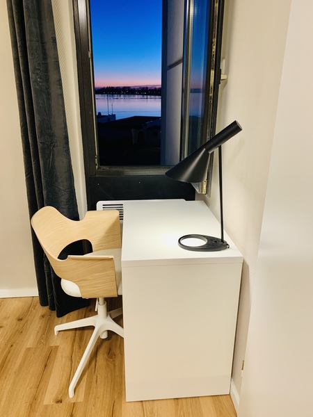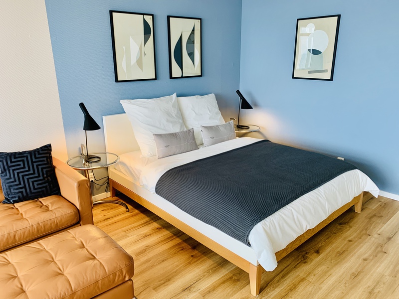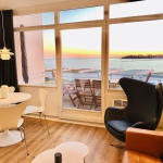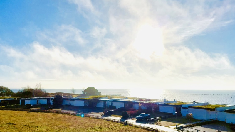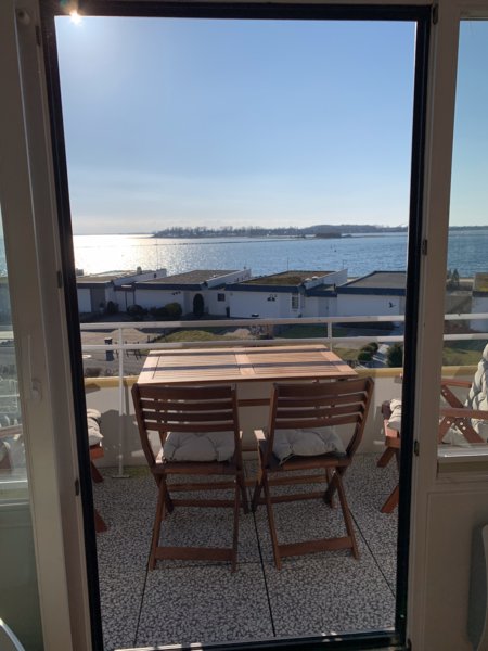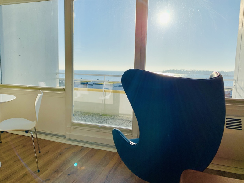 schnelles Internet per WLAN (bis zu 100 MBit/s ohne Volumenbegrenzung), großzügige Couch mit Hocker, dreh- und kippbarer "Ei-Sessel", Esstisch mit vier Stühlen (Original Arne Jacobsen) und Meerblick.