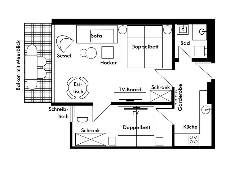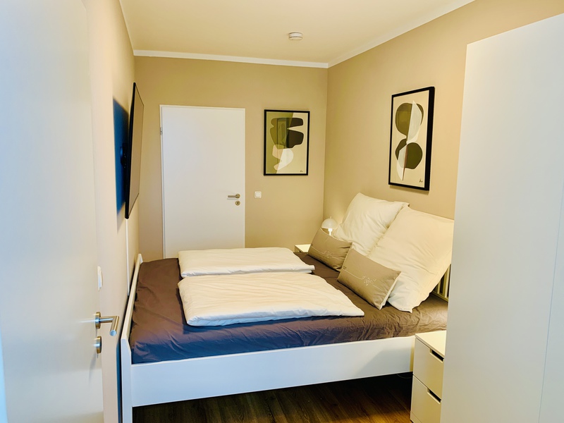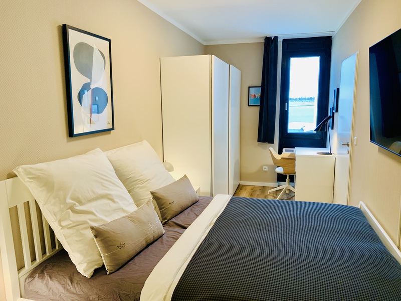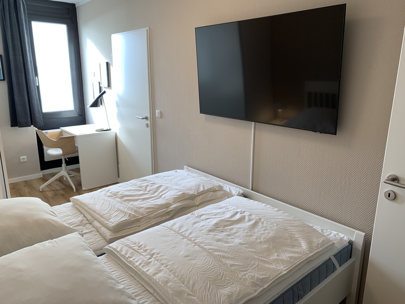 55 Zoll großer Smart-TV mit Internetanschluss (u.a. mit Apps für Amazon Video, Netflix, RTL+), kleiner Schreibtisch mit Stuhl und Meerblick, Verdunkelungsvorhang am Fenster. Doppelbett: 160 x 200 cm (zwei Matratzen à 80 x 200 cm), Matratzenschoner, flexible Lattenroste.