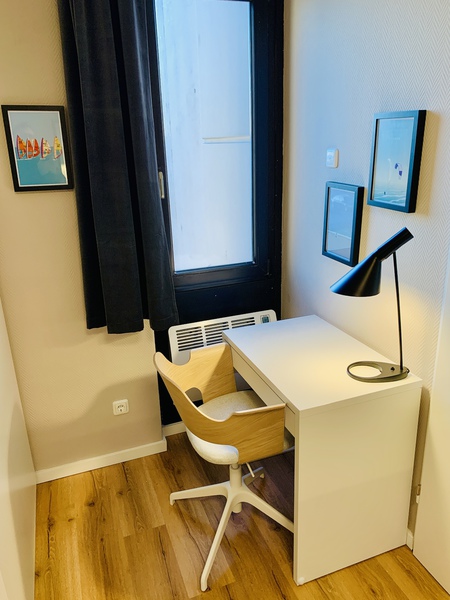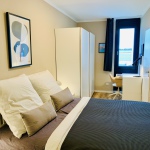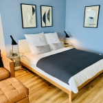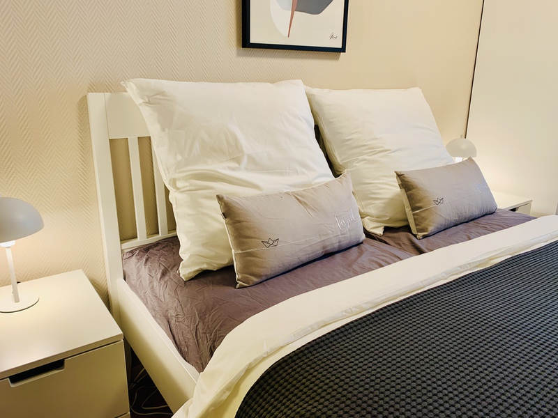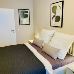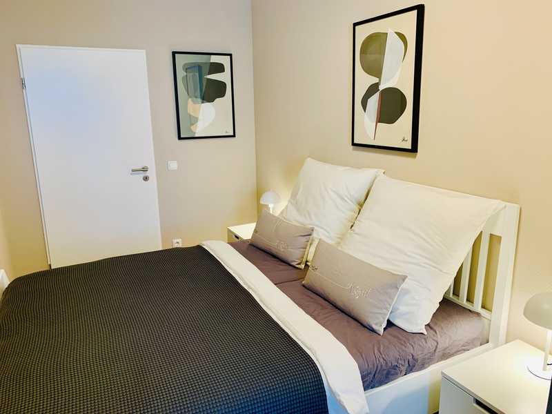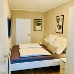 Verdunkelungsvorhänge an den Fenstern. Doppelbett: 160 x 200 cm (zwei Matratzen à 80 x 200 cm), Matratzenschoner, flexible Lattenroste.