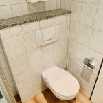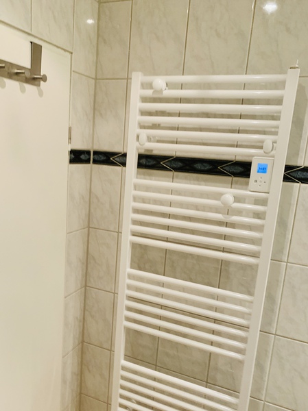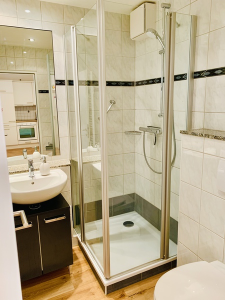 Niedrigschwellige Dusche mit Glastüren, WC, Handtuchheizkörper, Föhn.