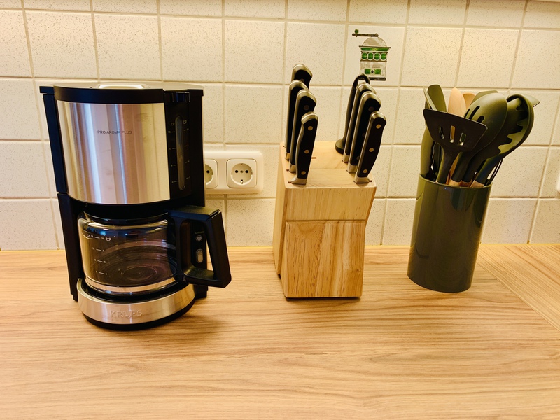 (Nespresso), Milchaufschäumer, Filterkaffeemaschine, 4-Zonen-Induktionskochfeld, Toaster, Wasserkocher und jede Menge Kleinkram.